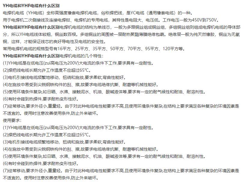 YH和YHF的主要區(qū)別在護(hù)套材料...YHF的護(hù)套材料比YH要求更高...機(jī)械性能更好..